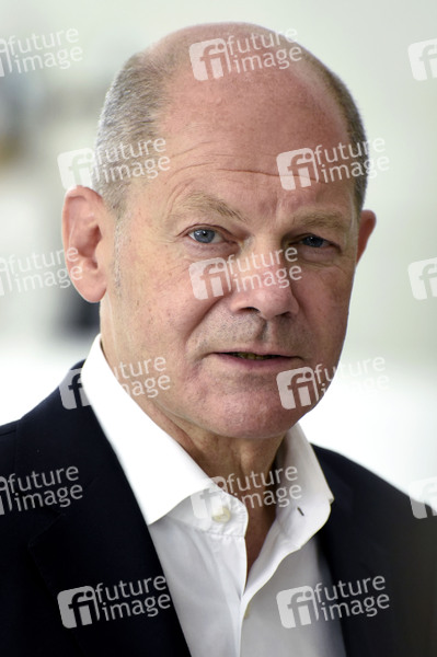 Olaf Scholz bei einem Statement nach einem Unternehmensbesuch bei der Merk KGaA im Innovation Center. Darmstadt, 26.08.2021