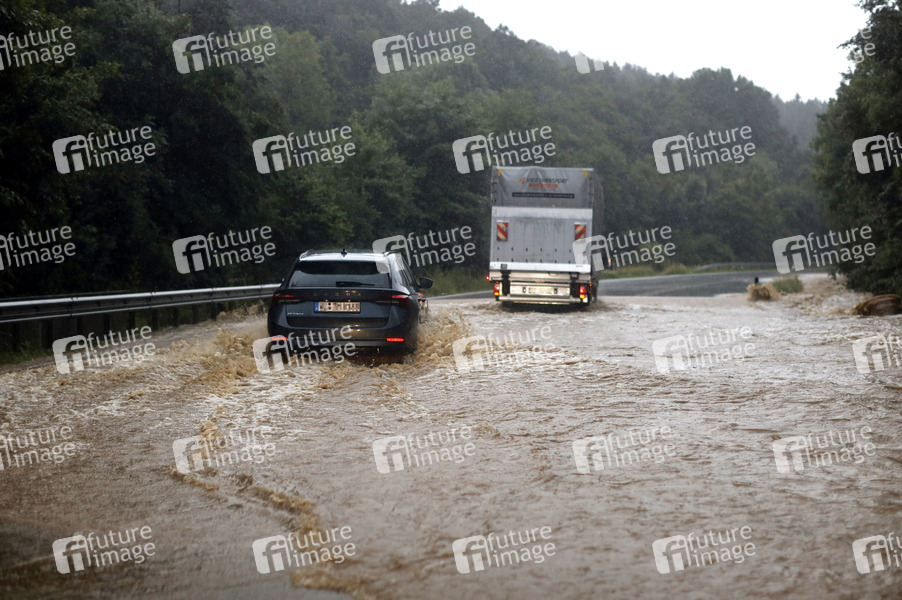 Die Landstraße L115 vor Ahrhütte mit dem Fluss Ahr im Ahrtal in Rheinland-Pfalz wurde durch starke Regenfälle sintflutartig überspült. Autos und LKWs auf dem Weg ins Tal mussten schließlich umkehren und zurück nach Blankenheim fahren. Viele Ortschaften in der Eifel sind nach den starken Regenfällen überflutet und abgeschnitten. Im Kreis Ahrweiler wurde der Katastrophenfall ausgerufen. Ahrhütte, 14.07.2021
