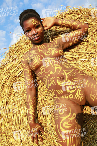 Bodypainting, Erotik, Frau, Mädchen, Afrikanerien, nackt, draußen, weiblich, Körperkunst, Kunst, Ornamente, Malerei, Feld, Acker, Stoppelfeld, Heuballen, Stroh, Landwirtschaft, Ernte, Abendsonne, erotic, African woman, girl, nude, outdoor, female, body art, body painting, ornaments, field, hay, straw, farming, harvest, evening sun
