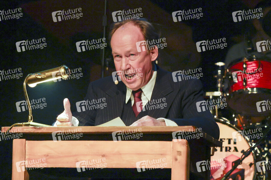 Ulrich Noethen und das Moka Efti Orchestra bei der musikalischen Lesung 'Der nasse Fisch' im Theater am Tanzbrunnen. Köln, 12.03.2025