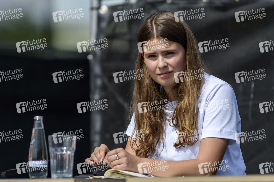 Die Fridays For Future-Klimaaktivistin Luisa Neubauer bei einer Pressekonferenz nach einem Gespräch mit Bundeskanzlerin Merkel auf dem Dach des Hauses der Kulturen der Welt. Berlin, 20.08.2020