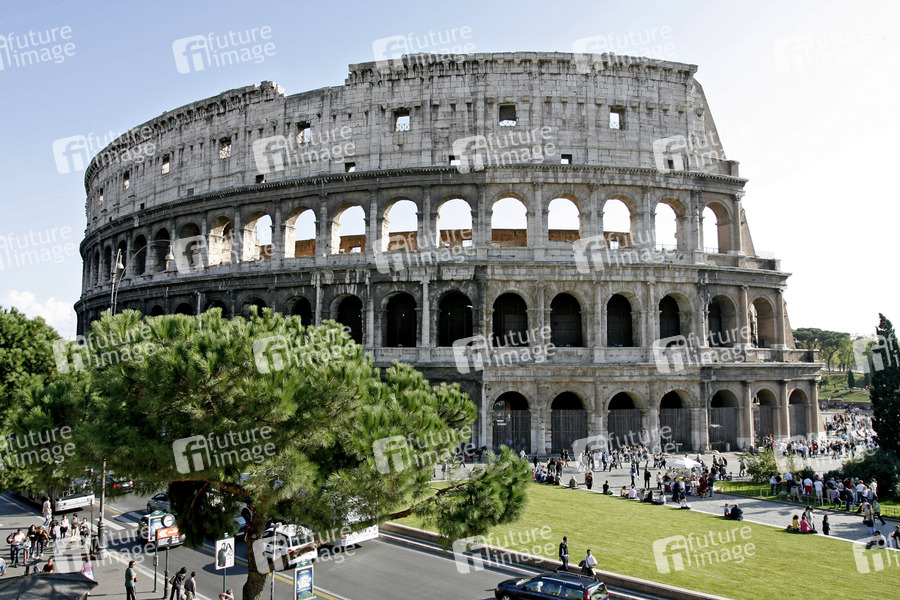 Antiker Name: Amphitheatrum Novum oder Amphitheatrum Flavium, der größte geschlossene Bau der römischen Antike, Fertigstellung im Jahr 80, es konnten ca. 50.000 Zuschauer Platz finden, das Kolosseum ist ellipsenförmig gebaut, Breite: 156 Meter, Länge: 188 Meter, Umfang: 527 Meter, Höhe: 48 Meter, es bestand aus drei übereinander angeordneten Arkadenreihen zu je 80 Bögen, als Arena war das Kolosseum über 400 Jahre lang in Betrieb, Veranstaltungsort von in aller Regel höchst grausamen Spielen, üblich waren vor allem Gladiatorenkämpfe (munera) und Tierhetzen (venationes)