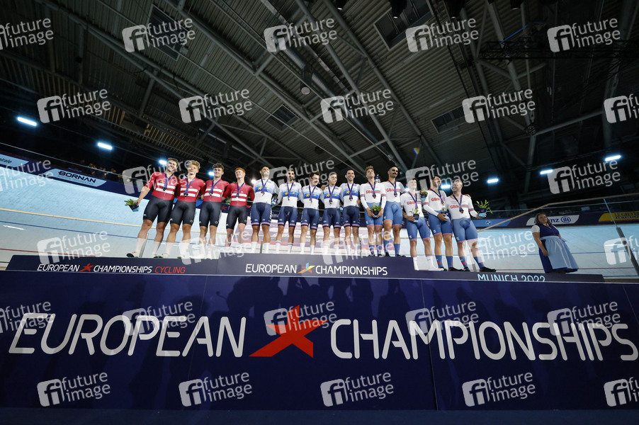 Siegerehrung Mannschaftsverfolgung Männer bei den European Championships 2022 im Bahnradsport in der Messe München. München, 12.08.2022