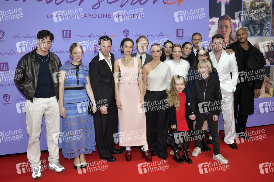 Levy Rico Arcos, Coco Carjell, Samuel Schneider, Emilia Schüle, Godehard Giese, Anneke Kim Sarnau, Mona Pirzad, Karoline Herfurth, Luna Krüger, Emilia Packard, Rurik Gislason, Milo Eisenblätter, Dilara Aylin Ziem, Friedrich Mücke und Malick Bauer bei der Premiere des Kinofilms 'Wunderschöner' im Zoo Palast. Berlin, 04.02.2025