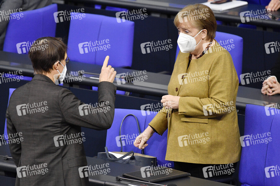 Karl Lauterbach und Angela Merkel in der 209. Sitzung des Deutschen Bundestages im Reichstagsgebäude. Berlin, 11.02.2021