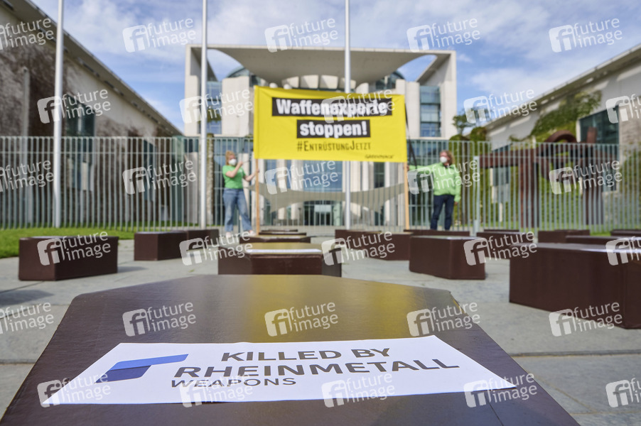 Aktivisten von Greenpeace protestieren mit Särgen vor dem Berliner Kanzleramt gegen die Rüstungsindustrie. Anlass ist die virtuelle Hauptversammlung von Rheinmetall. Berlin, 11.05.2021