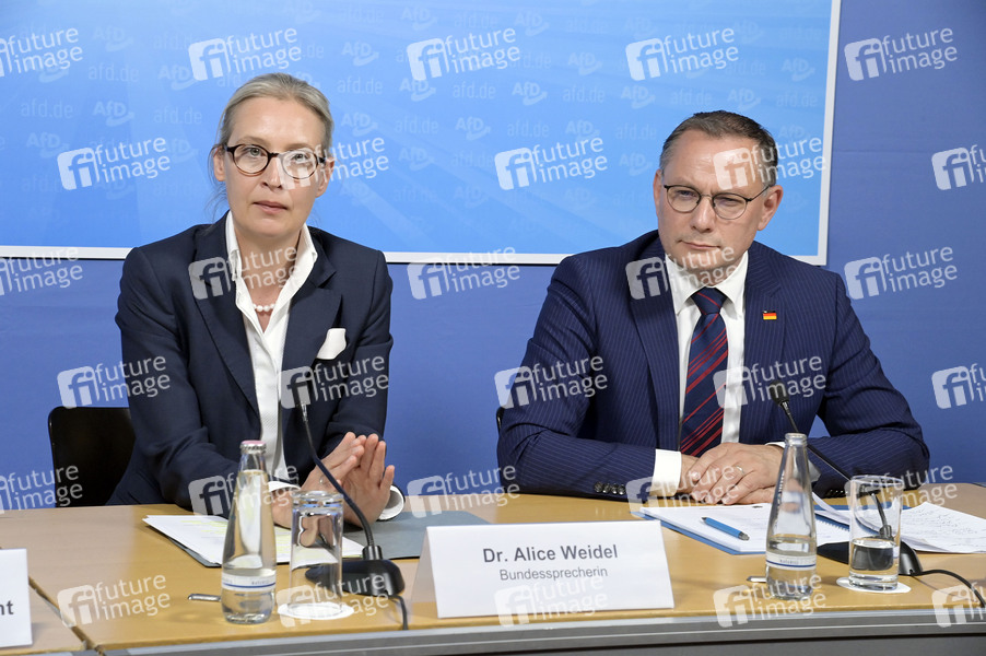 Alice Weidel und Tino Chrupalla bei der Pressekonferenz der AfD zur Europawahl 2024 im Haus der Bundespressekonferenz. Berlin, 10.06.2024