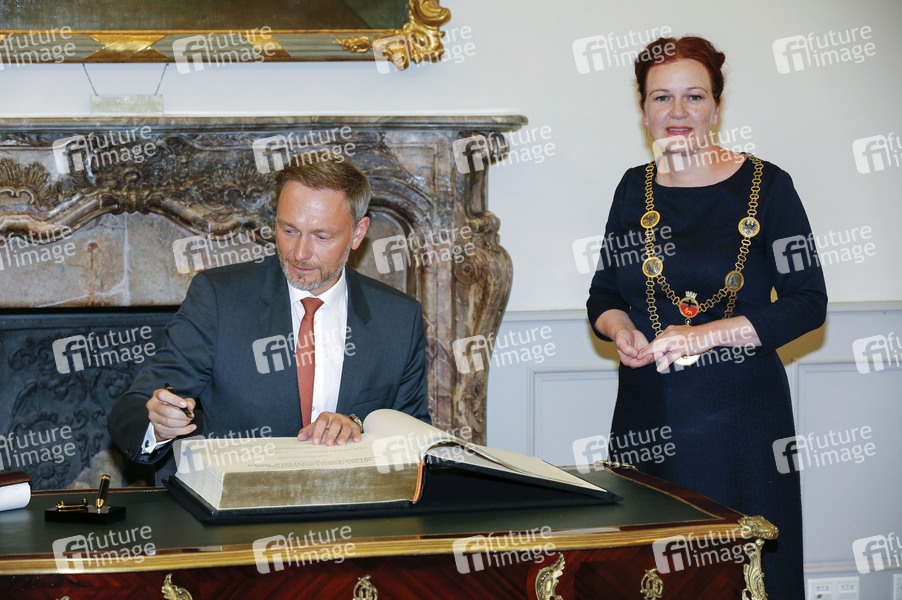 Christian Lindner und Katja Dörner beim Bildtermin vom Eintrag einiger G7-Finanzminister und Notenbankgouverneure ins Goldene Buch der Stadt Bonn im Alten Rathaus. Bonn, 19.05.2022
