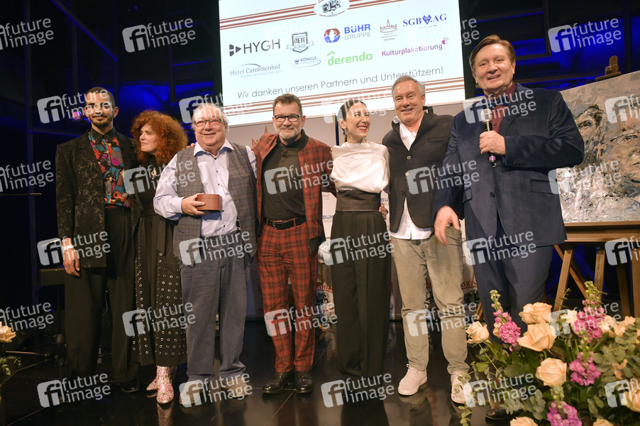 Leonard Burkhardt, Martina Dold, Jaecki Schwarz, Matthias Freihof, Sibel Kekilli, Nico Hofmann und Ulli Zelle bei der Verleihung des 17. Askania Award 2025 im Quatsch Comedy Club im Friedrichstadt-Palast. Berlin, 11.02.2025
