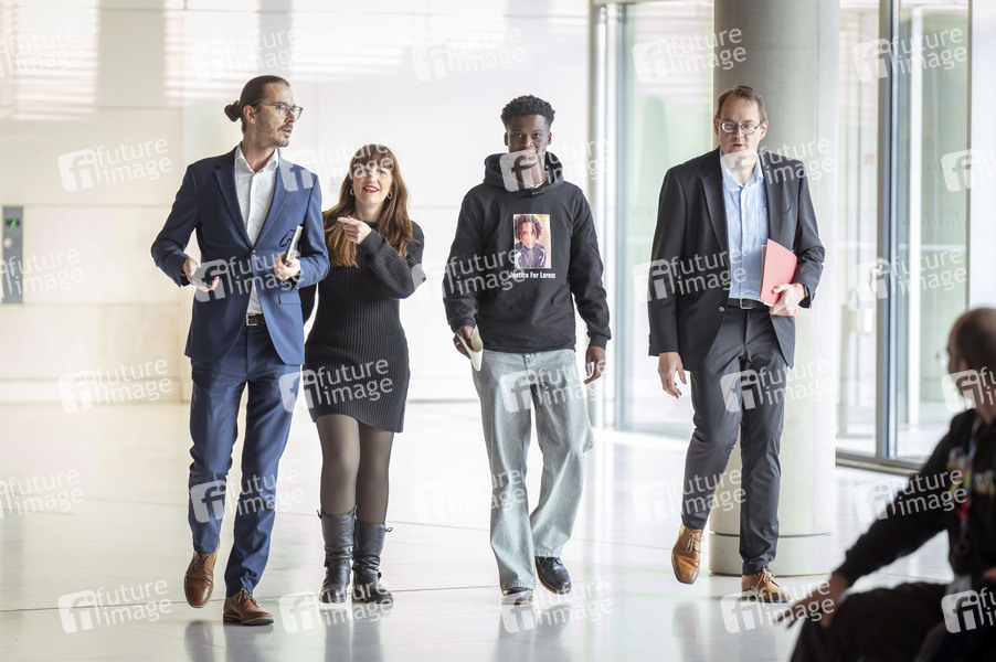 Heidi Reichinnek, Suraj Mailitafi und Sören Pellmann beim Pressestatement zur Fraktionssitzung der Bundestagsfraktion der Partei Die Linke im Reichstagsgebäude. Berlin, 24.11.2025