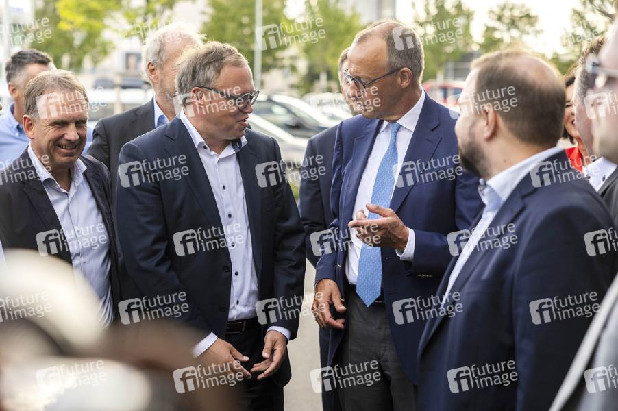 Mario Voigt und Friedrich Merz bei einer Wahlkampfveranstaltung der CDU zur Landtagswahl in Thüringen im Autohaus Peter. Erfurt, 21.08.2024