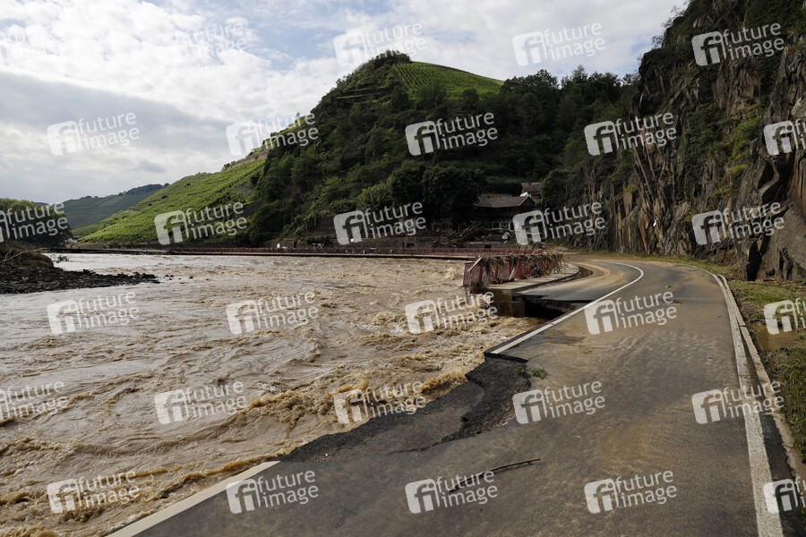 In der Eifel haben heftige Regenfälle und Dauerregen für Überschwemmungen und Überflutungen gesorgt. Im Ahrtal trat der Fluss vielerorts über die Ufer und überschwemmte nicht nur Keller sondern ganze Ortschaften. Im Bild die Straße zwischen Dernau und Walporzheim, die von den Fluten auf einem Abschnitt einfach mitgerissen wurde. Dernau, 15.07.2021