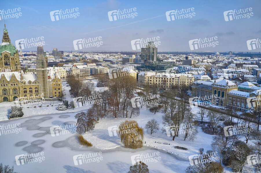 Luftbild vom verschneiten Maschpark mit dem Neuen Rathaus im Winter. (Der Drohnenflug wurde ordnungsgemäß bei der Polizei Leitstelle Hannover angemeldet) Hannover, 09.02.2021