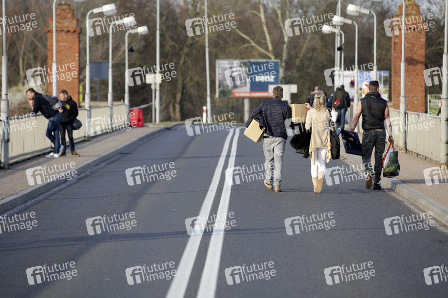 Passanten tragen Gegenstände über die Grenze von Küstrin nach Kostrzyn. Die Grenzen zwischen Polen und Deutschland sind wegen des Coronavirus geschlossen. Küstrin, 16.03.2020