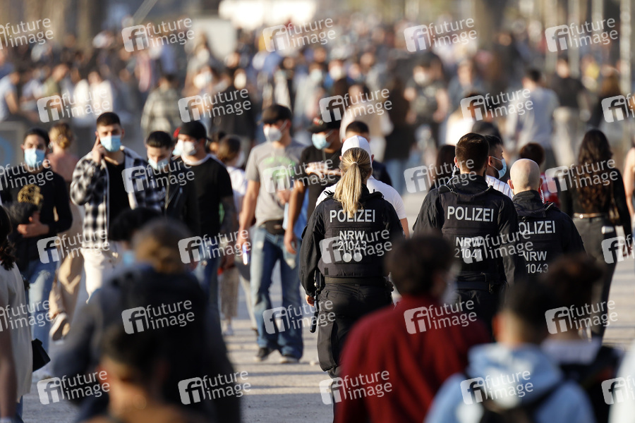 Polizei, Polizeikontrolle, Polizeidienst, Polizeistreife, Polizisten, Polizist, Polizistin, Polizeieinsatz, Beamte, Streife, Blaulicht, Polizeimaßnahme, Masken-Kontrolle, Maskenkontrolle, Verwarnung, Corona-Verstöße, Coronaverstöße, Corona-Verstoß, Coronaverstoß, Rheinboulevard, Kölner Rheinufer, Infektionsgeschehen, 7-Tage-Inzidenz, Abstand, Abstandsregeln, Ausgangsbeschränkung, Ausgangsbeschränkungen, Ausgangssperre, Ausgangssperren, Ausgangsverbot, Ausgangsverbote, Beschränkung, Bewegungsfreiheit, Corona, Coronaepidemie, Coronainfektion, Coronakontrolle, Corona-Kontrolle, Coronakrise, Corona-Krise, Coronamaßnahmen, Corona-Maßnahmen, Corona-Notbremse, Corona-Pandemie, Corona-Regeln, Corona-Schutz, Corona-Schutzmaßnahmen, Coronaschutzverordnung, Corona-Schutzverordnung, Corona-Test, Coronaviren, Corona-Viren, Coronavirus, Corona-Virus, Corona-Welle, Coronazahlen, Corona-Zahlen, Covid19, Covid-19, dritte Welle, Epidemie, erneuter Lockdown, Gesellschaft, Gesundheitsschutz, harter Lockdown, Hotspot, Hot Spot, Impfen, Impfverordnung, Infektionsgefahr, Infektionsschutzgesetz, Innenstadt, Inzidenzwert, Kontaktbeschränkungen, Lock Down, Lockdown, Lockdown Light, Maskenpflicht, Maßnahmen, Mindestabstand, Neuinfektionen, Notbremse, Oster-Lockdown, Pandemie, Pandemie-Gesetz, Passanten, R-Wert, Shopping, Sonnenlicht, Viren, Virus, Wocheninzidenz, zweite Welle, Infektionslage, Kontaktverbot, Versammlungsverbot, Menschenansammlung, Social Distancing