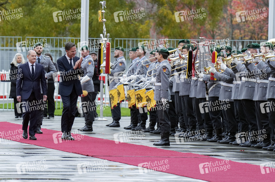 Olaf Scholz und Mark Rutte beim Empfang des NATO-Generalsekretärs mit militärischen Ehren und zu einem gemeinsamen Gespräch mit anschließendem Pressestatement im Bundeskanzleramt. Berlin, 04.11.2024