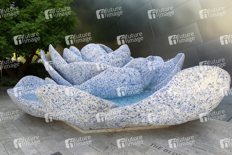 Gebäude aus rostfreiem Stahl, Architekt: Frank Gehry, eröffnet 23. Oktober 2003, Konzerthalle, Brunnen