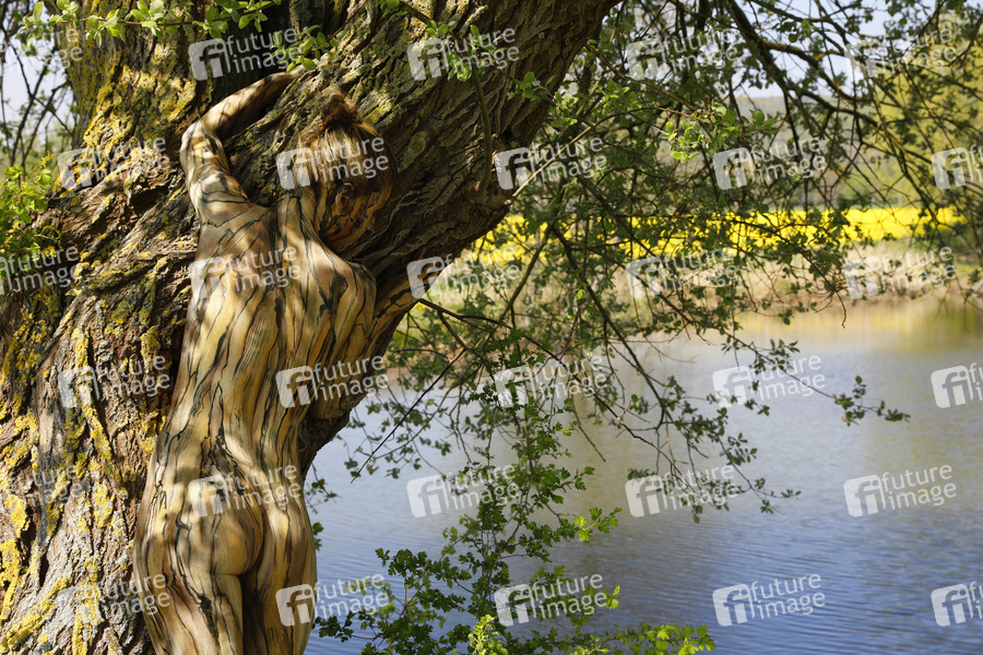 BodyArt, Bodypainting, Body-Painting, Künstler, Fineart, Körperkunst, Körperfarben, Körpermalerei, Farbe, Bemalung, Kunst, Malerei, Aktmodell, nackt, Akt, Bodypaintingmodell, versteckte Körper, getarnt, Natur, Baum, Feld, Gewässer, Teich, Baumrinde, Umweltschutz, Naturschutz, Klima, Klimaschutz, Landschaft, Umwelt, Jahreszeit, Frühling, natureart, body painting, nude, naked art, body art, colors, nature, tree, field, pond, tree bark, climate protection, landscape, environment, season, integration, camouflage, unity