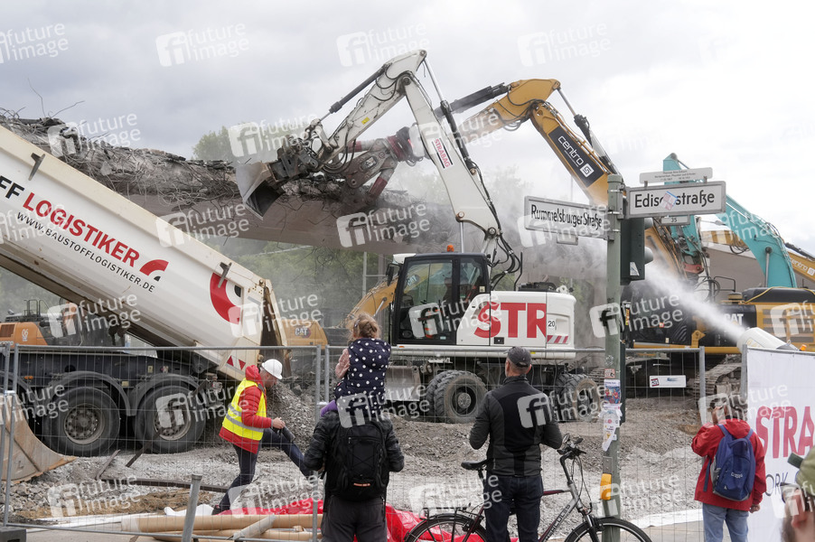 Der Abriss der maroden Brücke an der Wuhlheide (Oberschöneweide) geht zügig voran. Bereits am 2. Tag wird schon ein Teil der Brücke abgerissen. Die kaputte Brücke soll schnellstmöglich entfernt werden mit dem Ziel, die Freigabe der blockieren Straßenbahntrasse und Wiederherstellung des Fuß- und Radverkehrs zwischen Treskowallee und Edisonstraße möglichst bis zum 30. Mai. Berlin, 24.05.2025