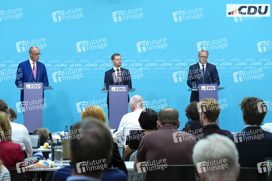 Friedrich Merz, Michael Kretschmer und Mario Voigt bei der Pressekonferenz der CDU nach den Landtagswahlen in Thüringen und Sachsen im Konrad-Adenauer-Haus. Berlin, 02.09.2024