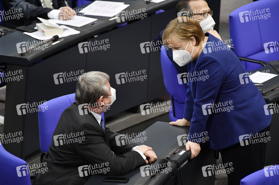 Hermann Gröhe und Angela Merkel in der 212. Sitzung des Deutschen Bundestages im Reichstagsgebäude. Berlin, 25.02.2021