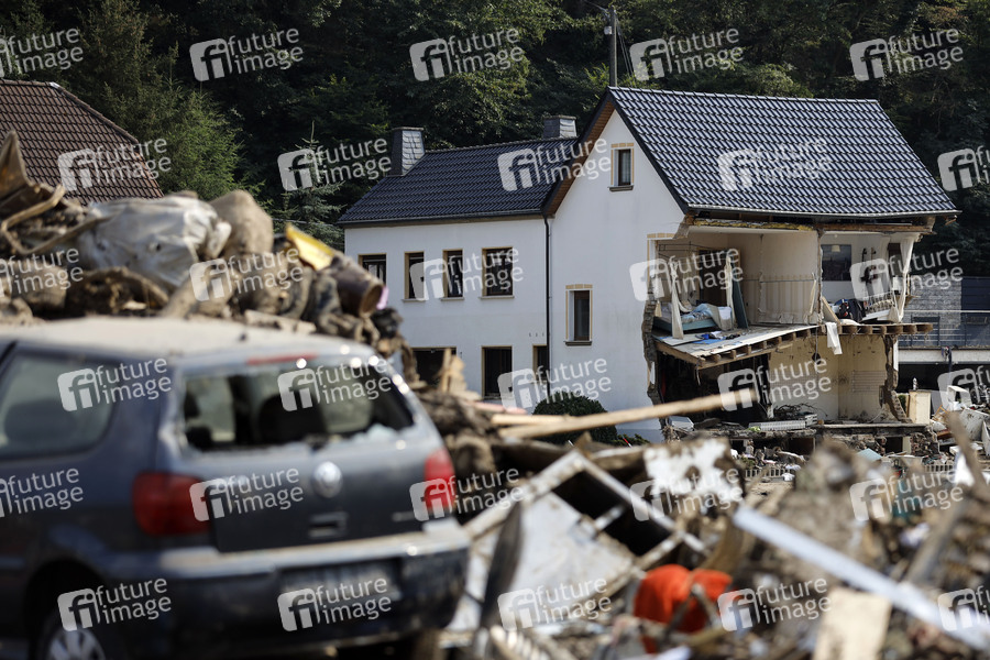 Nach dem Jahrhunderthochwasser in der Eifel durch heftige Regenfälle und Dauerregen mit Überschwemmungen und Überflutungen haben die Aufräumarbeiten im Ahrtal begonnen. Einheiten von Polizei, THW, Bundeswehr und Feuerwehr mitsamt vielen freiwilligen Helfern räumen Straßen, entfernen Schutt und Schlamm und versorgen die Menschen. Im Bild zerstörte Häuser an der Uferpromenade in der Ortschaft Dernau, in der die Flut viele Häuser zerstörte, 22.07.2021