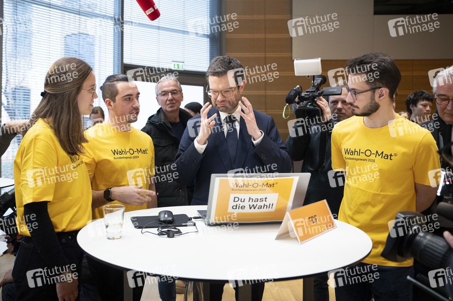 Marco Buschmann bei der Pressekonferenz zur Vorstellung des Wahl-O-Mat zur Bundestagswahl 2025 im dbb forum. Berlin, 06.02.2025
