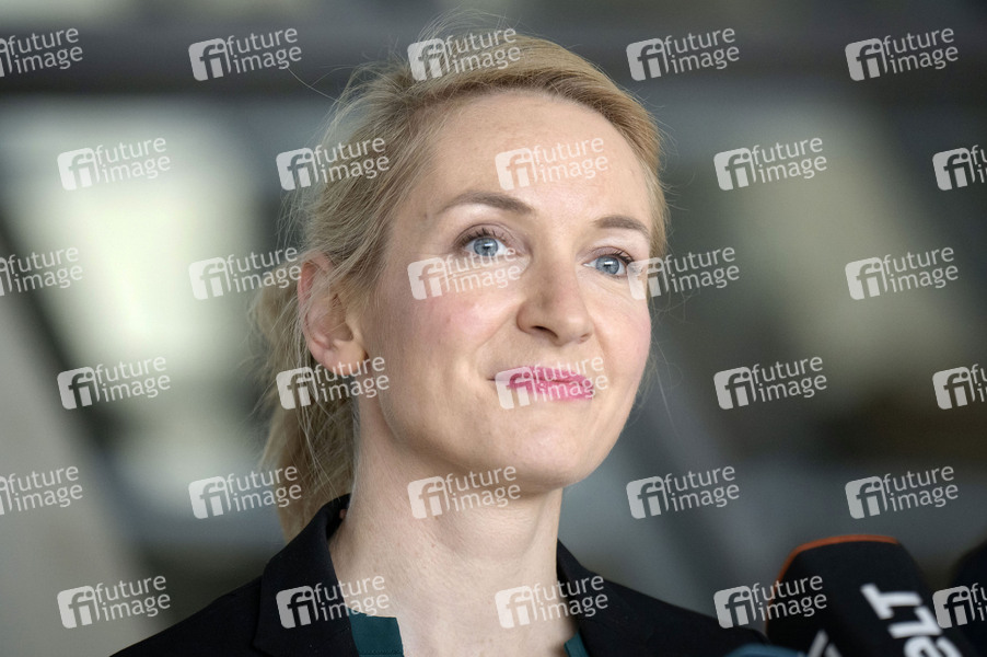 Ines Schwerdtner bei einem Pressestatement der Bundestagsfraktion der Partei Die Linke im Reichstagsgebäude. Berlin, 09.04.2025