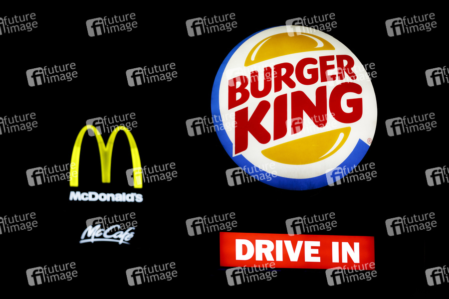 McDonald's, McDonald, McDonalds, Mc Donalds, Burger, Fast Food, Fastfood, Restaurant, DriveIn, Drive In, Drive-in, Drive-thru, Schnellrestaurant, Ernährung, Fritten, Softdrinks, Cola, Menü, Sparmenü, Whopper, BigMäc, Big Mäc, Cheeseburger, Hamburger, Ketchup, Majo, McCafe, Schnellrestaurantkette, Systemgastronomie, Franchising, Konkurrenz, Konkurrent, Marktführer, Filiale, Logo, Bildmarke, Wortmarke, Markenrecht, Mahlzeit, Kalorien, Fett, gesunde Ernährung, Ernährungspyramide, Fast-Food-Kette, Leuchtreklame, Reklame, Symbolbild, Symbolfoto