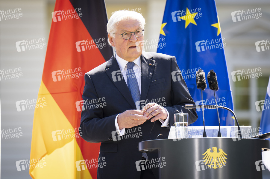 Frank-Walter Steinmeier bei einer gemeinsamen Pressekonferenz des Präsidenten des Staates Israel und des Bundespräsidenten im Schloss Bellevue. Berlin, 12.05.2025