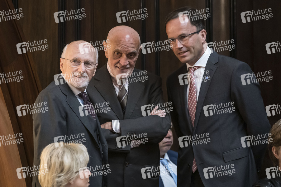 Dirk Rossmann, Martin Kind und Jochen Köckler beim Empfang zum 75. Geburtstag von Ehrenbürger und Bundeskanzler a.D. Gerhard Schröder im Neuen Rathaus. Hannover, 24.04.2019