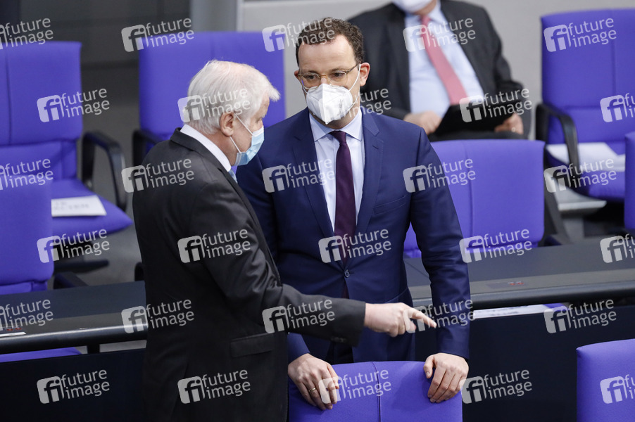 Horst Seehofer und Jens Spahn in der 203. Sitzung des Deutschen Bundestages im Reichstagsgebäude. Berlin, 13.01.2021