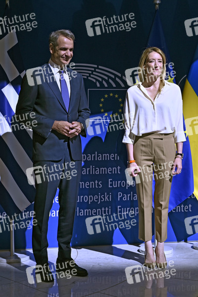 Kyriakos Mitsotakis und Roberta Metsola beim Fototermin im Europäischen Parlament. Straßburg, 05.07.2022