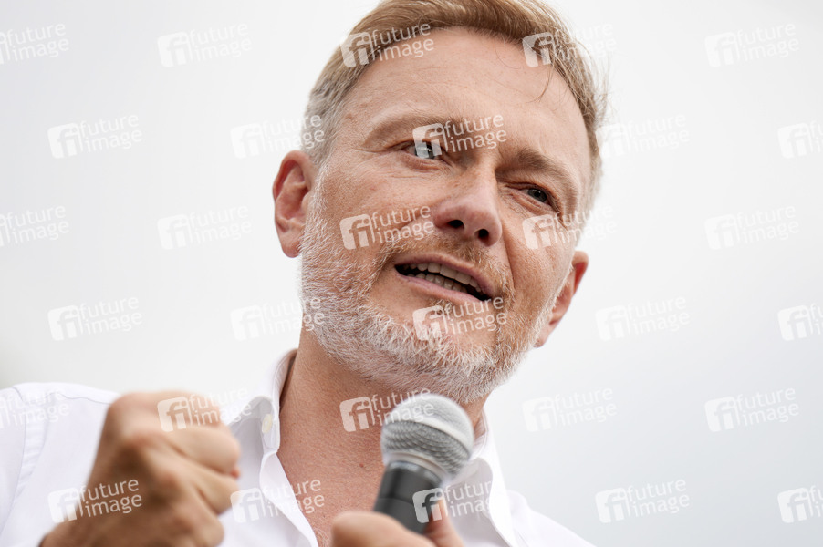 Christian Lindner bei einer Wahlkampfveranstaltung der FDP zur Landtagswahl in Brandenburg im Mahlower Seebad. Blankenfelde-Mahlow, 15.08.2024