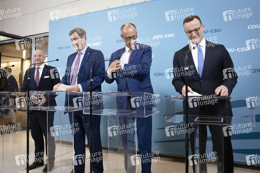 Alexander Hoffmann, Markus Söder, Friedrich Merz und Jens Spahn beim Pressestatement zur Fraktionssitzung der CDU/CSU-Bundestagsfraktion im Reichstagsgebäude. Berlin, 05.05.2025