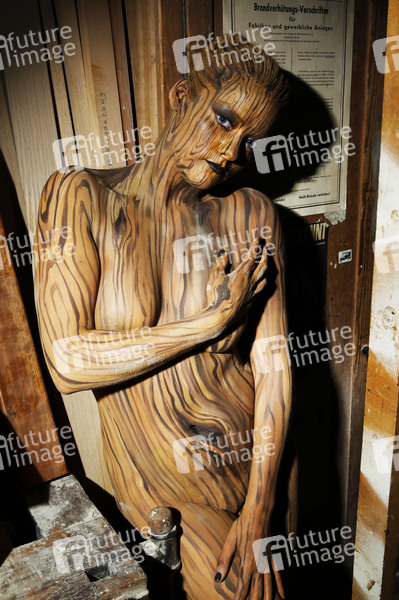 Tischlerei-Bodypainting mit Model Daniela als Holzstück in der Tischlerei Danielsen als Teil des Projekts 'Working Art' des Künstlers Jörg Düsterwald und des Fotografen Tschiponnique Skupin, in dem sie Menschen per Bodypainting in klassischen Berufssituationen zeigen. Hameln, 01.02.2014