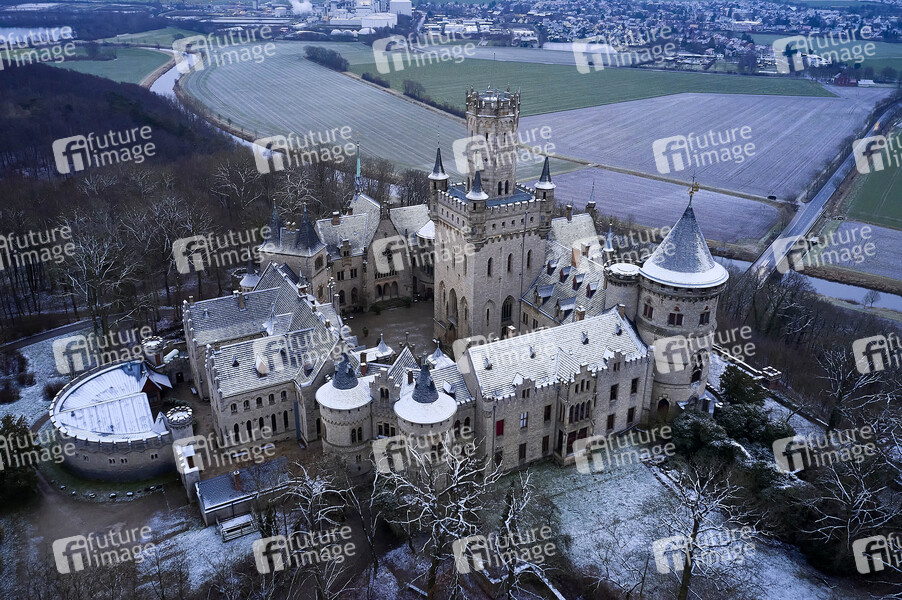 Luftaufnahme, offizieller Wohnsitz der Prinzen von Hannover, Welfen, Bauzeit 1857-1867, Ernst August von Hannover, Neugotik, Architekt: Conrad Wilhelm Hase, Pattensen, Winter, Schnee