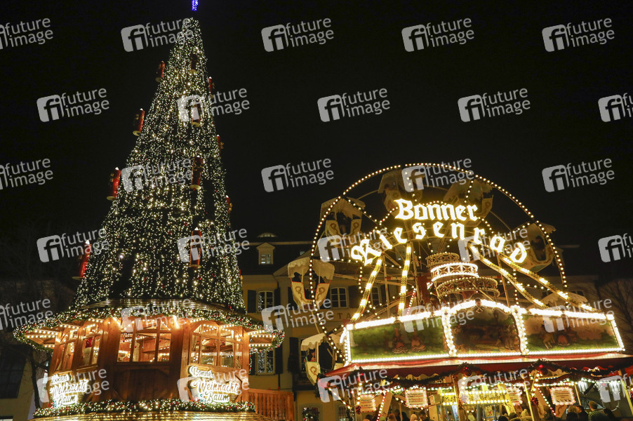 Bonner Riesenrad - Jedes Jahr verwandelt sich die Bonner Innenstadt in eine stimmungsvolle Budenstadt, dem Bonner Weihnachtsmarkt. Kunsthandwerk, Fahrgeschäfte und viele kulinarische Köstlichkeiten machen den Besuch bei gemütlicher Atmosphäre zu einem kleinen Erlebnis. Energiesparmaßnahmen finden sich in der LED-Technik, im begrenzten Zeitraum der Beleuchtungen nur zwischen 16 und 22:00 Uhr sowie beim Verzicht auf Heizpilze. Bonn, 03.12.2022
