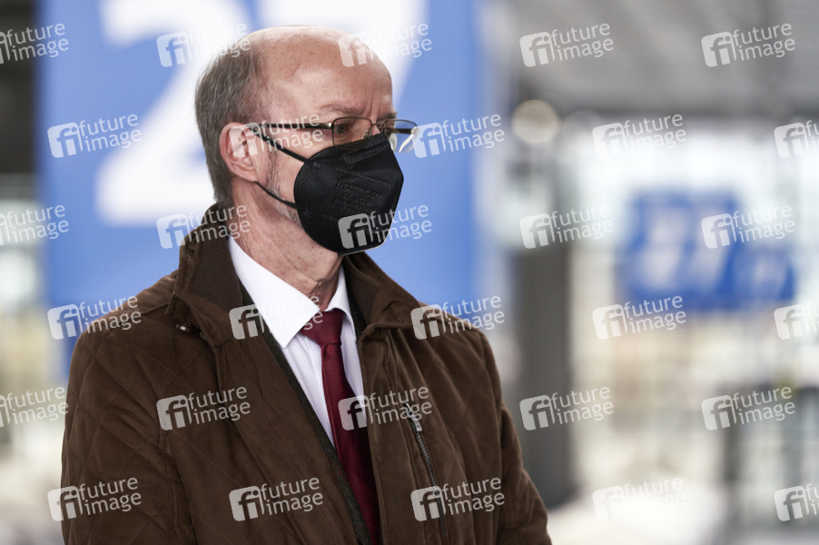 Volker Kluwe (Polizeipräsident der Polizeidirektion Hannover) - Zeltdörfer-Unterkünfte für ukrainische Kriegsflüchtlinge in der Halle 27 auf dem Messegelände, inklusive Wasch- und Duschmöglichkeiten, errichtet von der Feuerwehr Hannover. Die spätere Versorgung erfolgt durch das DRK. Hannover, 06.03.2022