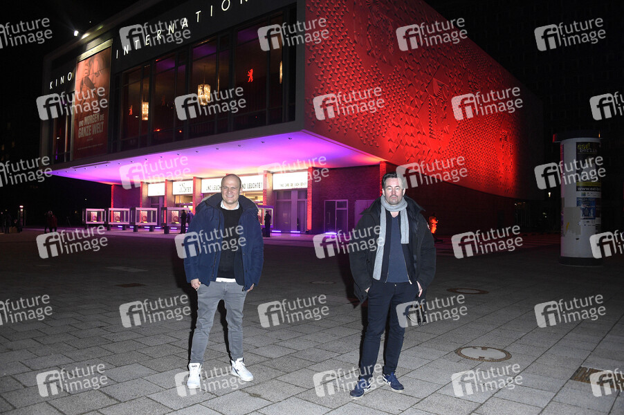 Christian Bräuer, Vorstand der AG Kino, und Christian Schwochow vor dem Kino International bei der Aktion 'Kino leuchtet. Für dich.' anlässlich der nur für die Fachwelt virtuell stattfindenden Berlinale und im Hinblick auf die Beratungen der Regierungschef:innen von Bund und Ländern über den Stufenplan zur Wiedereröffnung mit Blick auf die immer noch geschlossenen Kulturorte. Berlin, 28.02.2021
