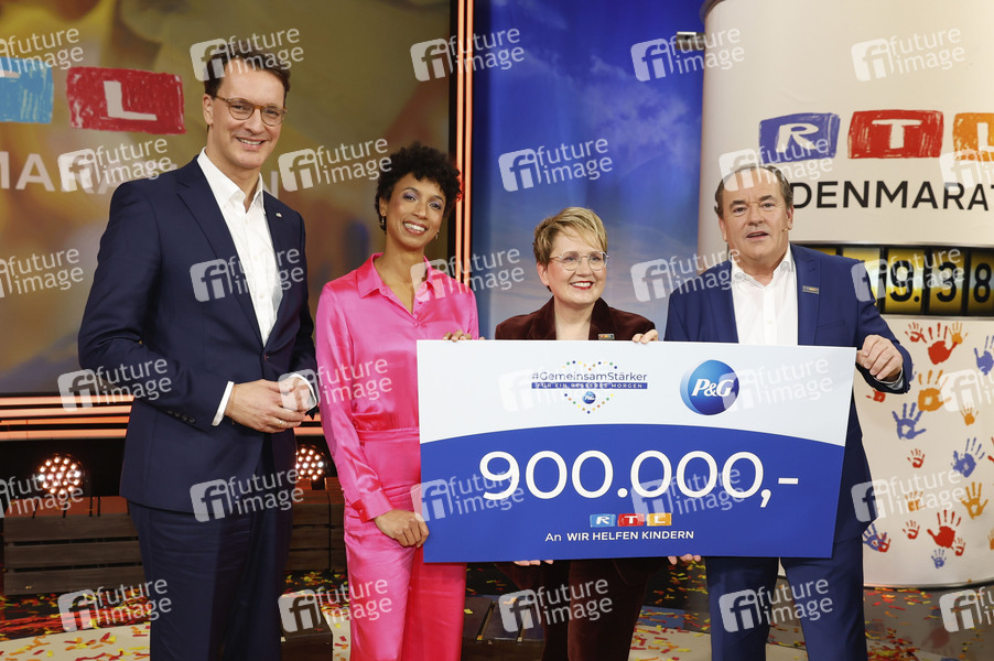 Hendrik Wüst, Malaika Mihambo, Gabriele Hässig und Wolfram Kons beim 29. RTL-Spendenmarathon 2024 im Studio 8 der EMG Studios. Hürth, 22.11.2024