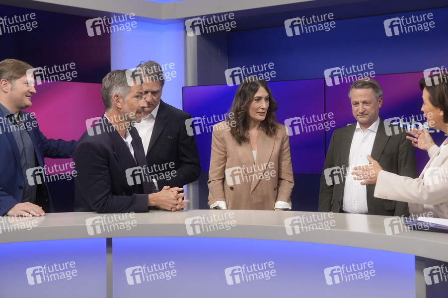 Michael Bröcker, Micky Beisenherz, Jakob Augstein, Anja Kohl, Nikolaus Blome, Sandra Maischberger in der ARD-Talkshow 'maischberger' im Studio Berlin Adlershof. Berlin, 19.05.2025
