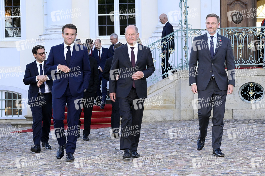 Emmanuel Macron, Olaf Scholz und Christian Lindner beim Treffen des Deutsch-Französischen Ministerrats im Gästehaus der Bundesregierung Schloss Meseberg. Meseberg, 28.05.2024