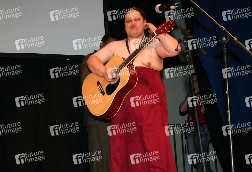 Musiker, Con-Helfer löst verlorene Saalwette ein. Er tritt nackt auf und spielt Gitarre