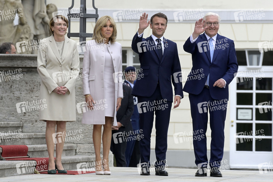 Elke Büdenbender, Brigitte Macron, Emmanuel Macron und Frank-Walter Steinmeier beim Empfang des Staatspräsidenten der Französischen Republik mit militärischen Ehren im Schloss Bellevue. Berlin, 26.05.2024