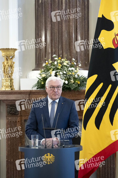Frank-Walter Steinmeier bei der Übergabe der Wohlfahrtsmarken 2025 durch den Bundesminister der Finanzen an den Bundespräsidenten im Schloss Bellevue. Berlin, 21.02.2025
