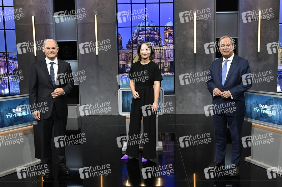 Olaf Scholz, Annalena Baerbock und Armin Laschet beim 'Triell - Dreikampf ums Kanzleramt' von ProSieben, SAT.1 und Kabel Eins mit den Kanzlerkandidaten im Studio Berlin-Adlershof. Berlin, 19.09.2021