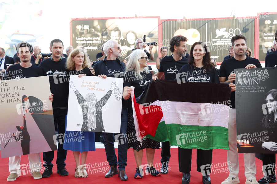 Prominenz, Celebrity, Celebrities, Filmpremiere, Premiere, Roter Teppich, Ankunft, Unterhaltung, Entertainment, Kultur, Kino, Film, Filmfest, Filmfestival, 80. Mostra Internazionale d'Arte Cinematografica di Venezia, The 80th Venice International Film Festival, Proteest, Demo, Demonstration