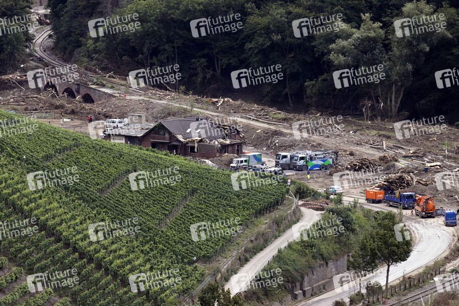 Nach dem Jahrhunderthochwasser in der Eifel durch heftige Regenfälle und Dauerregen mit Überschwemmungen und Überflutungen haben die Aufräumarbeiten im Ahrtal große Fortschritte gemacht. Einheiten von Polizei, THW, Bundeswehr und Feuerwehr mitsamt vielen freiwilligen Helfern haben Straßen geräumt, Schutt und Schlamm entfernt und die Menschen versorgt. Der Wiederaufbau wird trotzdem Jahre dauern. Im Bild Flutschäden in der Ortschaft Dernau, in der die Flut viele Häuser zerstörte, 08.08.2021