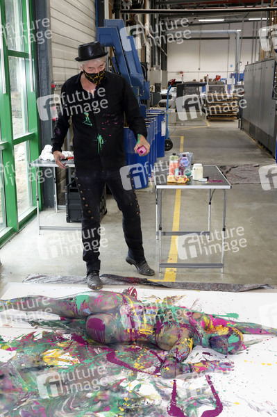 Jörg Düsterwald, einer der bekanntesten Bodypainting- und Bodyartkünstler Deutschlands macht auf seine ganz eigene Art auf die prekäre Situation freischaffender Künstler während der Corona-Pandemie aufmerksam: Unter dem Hashtag #WirzeigenFarbe hat der Hamelner Künstler in der Produktionshalle der Druckerei QUBUS media mit seinem Model Lisa ein ausdruckstarkes Live-Bodypainting inszeniert - denn Künstlerinnen und Künstler wie er sehen und fühlen sich derzeit wortwörtlich 'ausgezogen bis aufs letzte Hemd'. Und nichts symbolisiert diesen bekannten Spruch besser als ein Bodypainting auf nackter Haut in einer Umgebung, in der es jeden Tag um Farbe geht. Die Live-Performance fand mit dem zeitgleichen Druckstart von Jörg Düsterwald's neuem Premiumkalender 'Bodypainting in Nature 2021' statt. Hannover, 14.07.2020